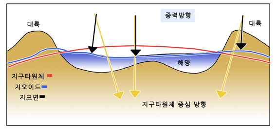 평균 해수면을 이용하여 지구의 모양을 나타낸 것이다. 지구의 모양을 나타내는 데는 지표면을 그대로 나타내는 방법과 지구를 단순히 회전 타원체로 나타내는 방법이 있다. 그러나 지표면을 실제로 나타내기란 매우 어렵고, 지구 타원체를를 이용하는 방법은 지표면의 요철(凹 · 凸)을 전혀 나타낼 수 없다는 단점이 있다. 그래서 지표면보다는 단순하면서도 회전 타원체보다는 실제에 가깝게 지구의 모양을 나타낸 것이 지오이드이다. 지오이드는 지표면의 70%를 차지하는 해수면의 평균을 잡아서 육지까지 연장한 것으로 어디에서나 중력 방향에 수직이며, 해양에서는 평균 해수면과 일치하고 육상에서는 땅 속을 통과하게 된다. 또한 그 높이가 항상 0m로, 측량 해발고도의 기준면이 된다. 지오이드면은 실제 지구 모양과 지구 타원체의 중간에 위치한다고 생각하면 기억하기 쉽다. (출처:네이버 지식백과)